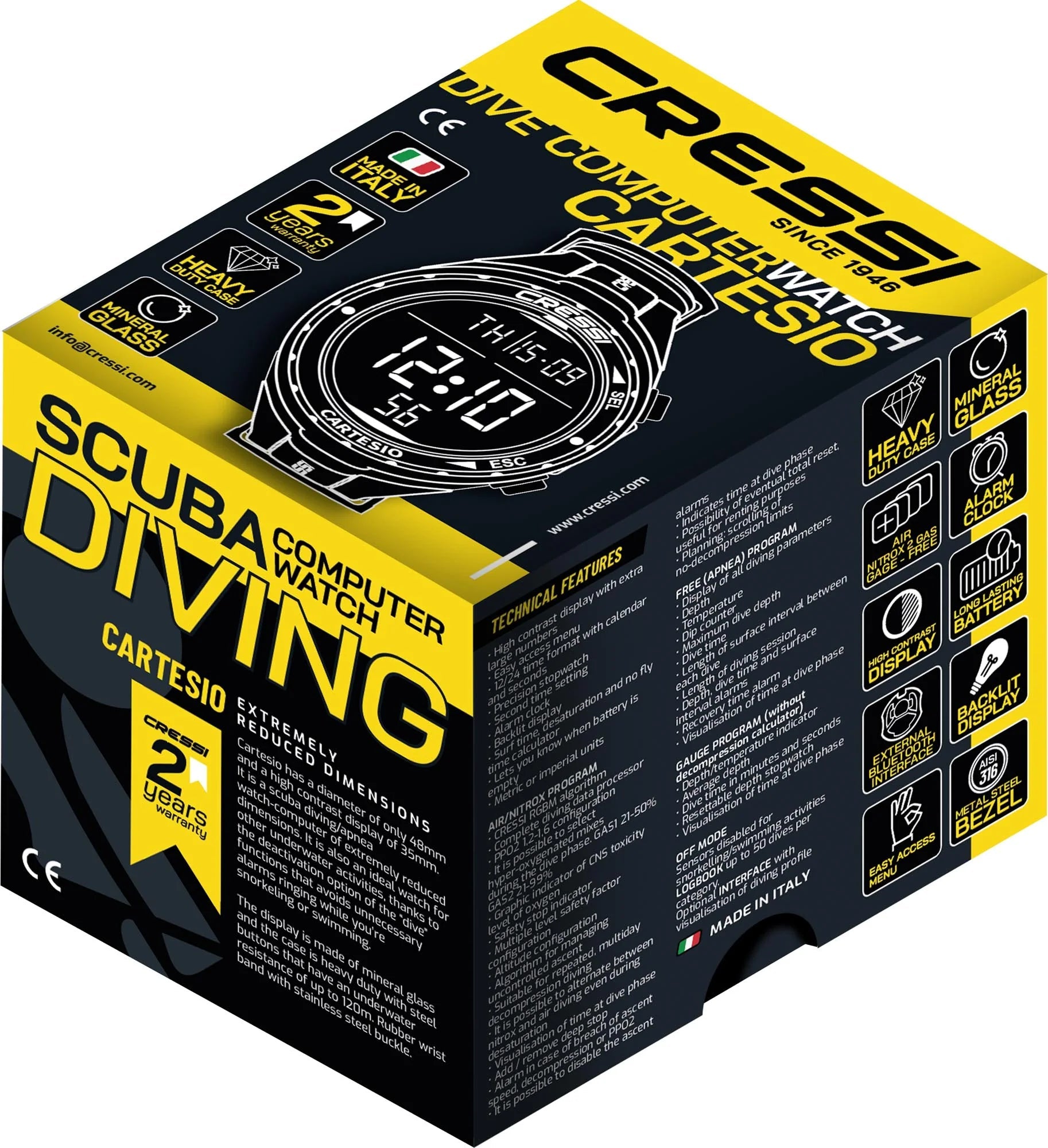 The Cressi Cartesio is a versatile dive computer engineered for both technical exploration and casual wear. Its refined watch-style design features a robust metal bezel, seamlessly transitioning from the dive site to everyday settings. This compact instrument delivers professional-grade performance across four operational modes—Air, Nitrox, Gauge, and Free—making it ideal for recreational and technical divers alike. Support for dual Nitrox gas mixes enables progression into advanced diving disciplines. Built with precision engineering and ergonomic construction, the Cartesio provides the reliability and functionality serious divers demand without compromising on aesthetics.